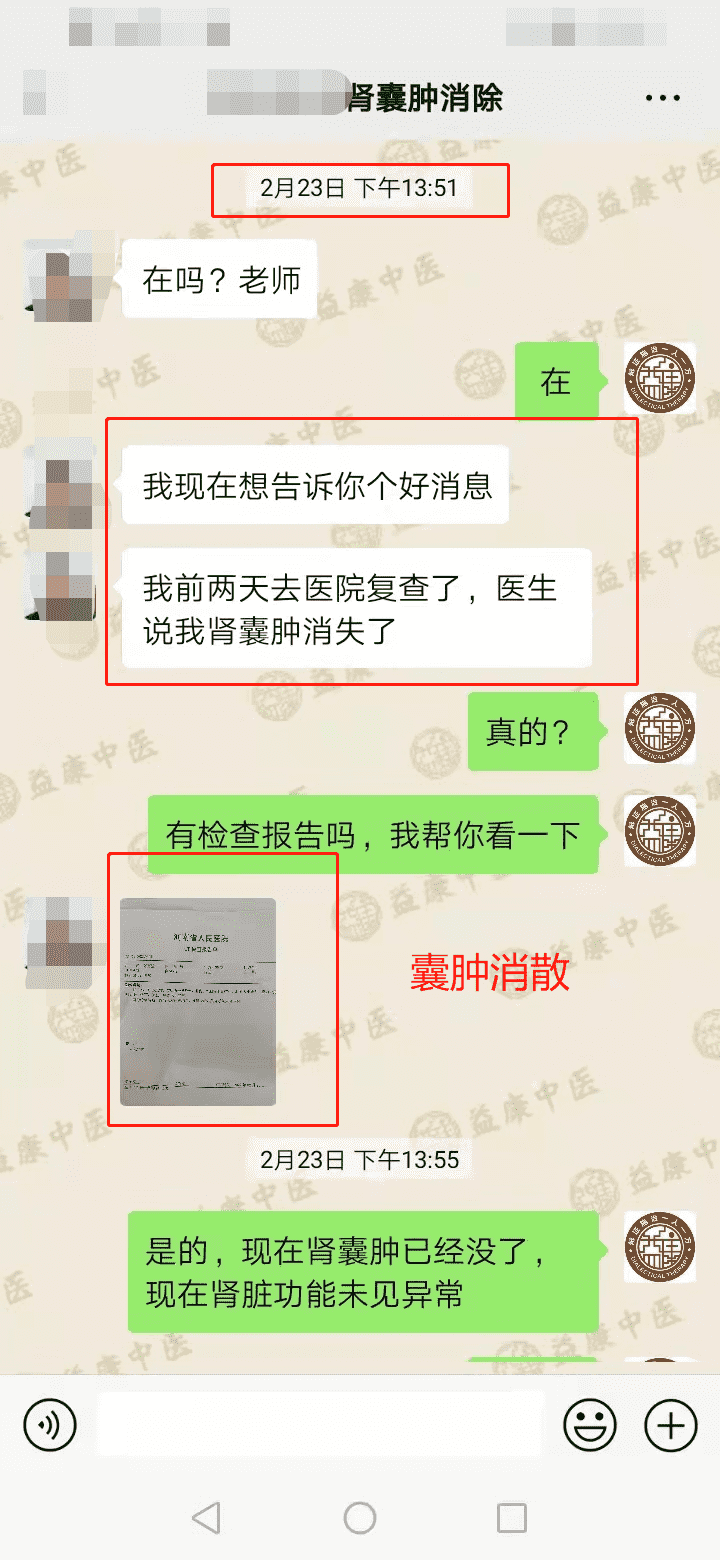 正在我一筹草展的时候,我闺女的同学的爸爸带来了好消息,他闺女也是肾囊肿,吃了三个疗程的药就治好了。我赶紧问他是怎么治好的,他给我推荐了治疗肾囊肿的老中医,说是名医世家,在当地非常有名,治愈的患者无数。我一听总算是有了一线希望。