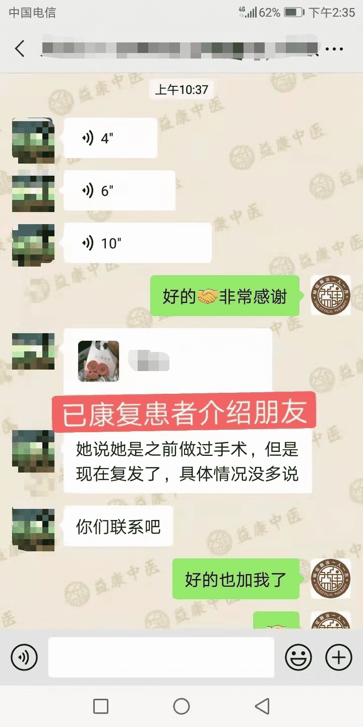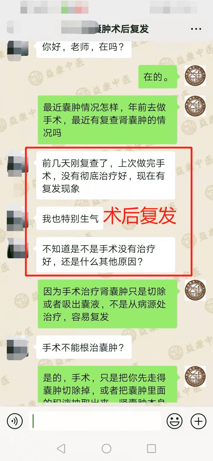从决定保守治疗开始我就不停的寻找治疗的办法,什么小偏方,磁疗仪,保健品,我吃了不计其数,钱花了不少可是一点效果都没有。家里人也开始对我有意见,今天我一个亲戚给我介绍了一个老中医老中医,说是出身四世中医世家,专门治疗肾囊肿的,经验非常丰富,很多的肾囊肿的病友都是慕名而去的,我决定最后试一下,就加了老中医的微信,每天的记录我都会记录,希望可以帮助到各位病友。